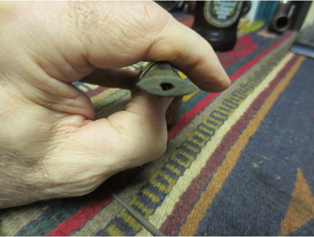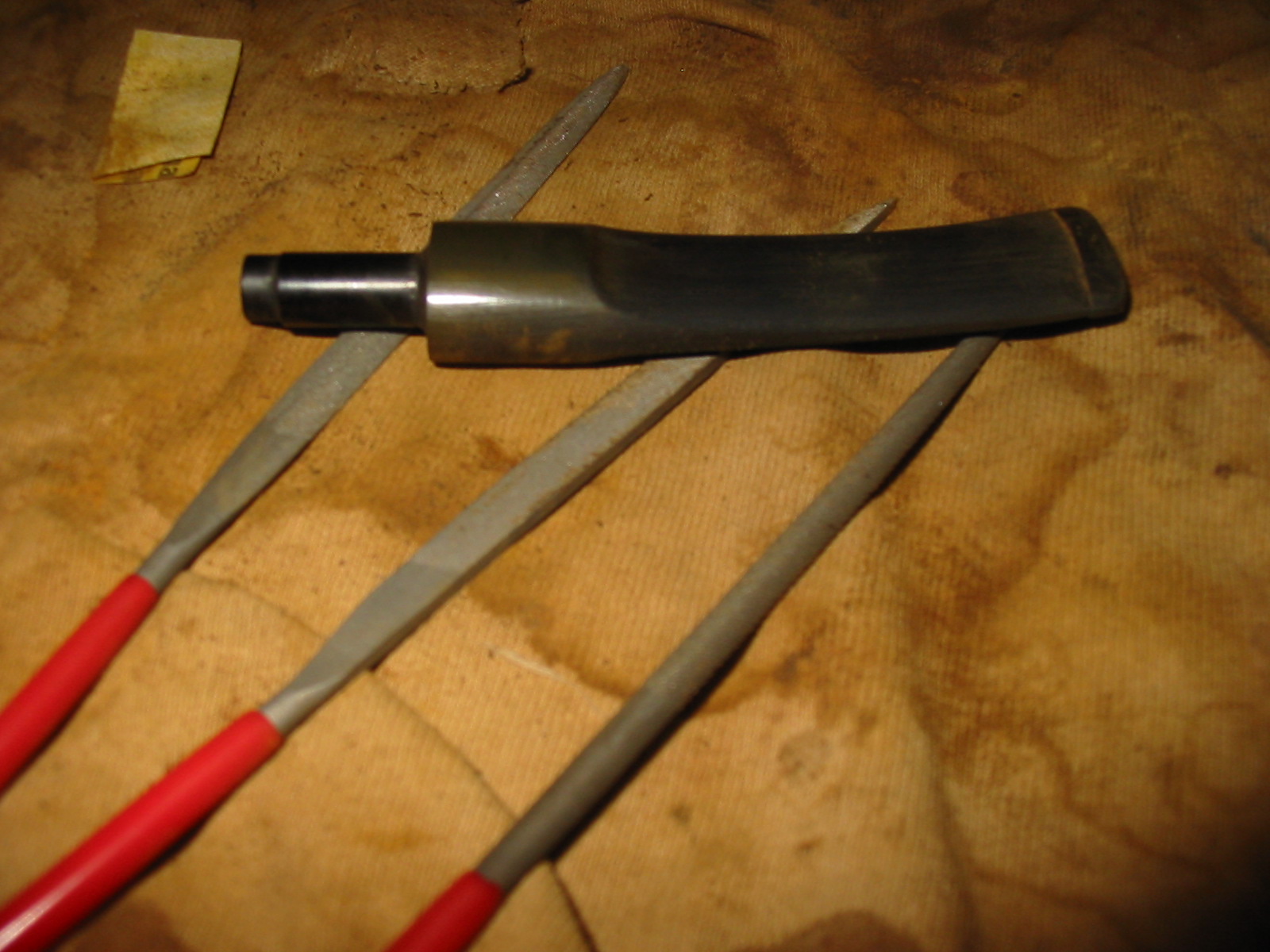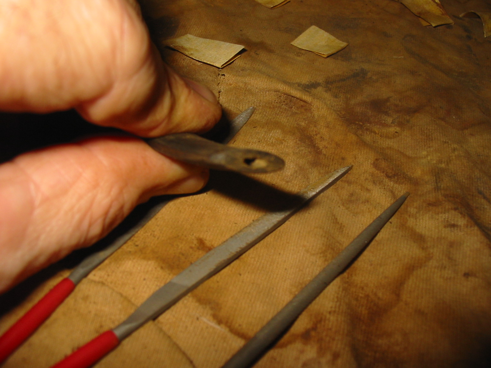 I used a needle file to recut the edge of the button and square it off with the surface of the stem. I wanted a sharp delineation from the button surface to the stem surface. I also reshaped the button surface as well with the files. The new button is beginning to be visible at this point.