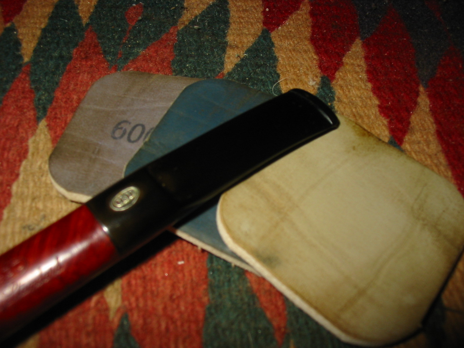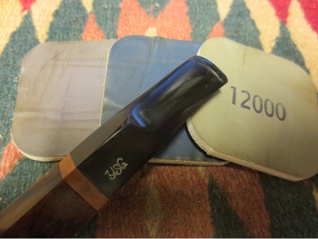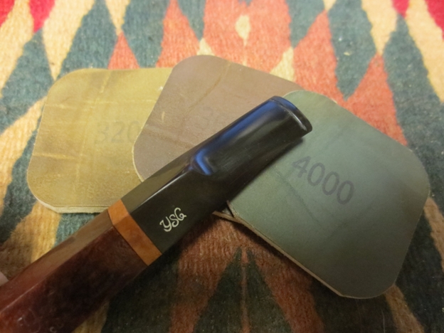 I used a needle file to open the twin bore airways and smooth them out. I began to polish the stem and button with micromesh sanding pads – wet sanding the button and stem area with 1500-2400 grit sanding pads. I wiped the stem down with a damp cotton pad to see what the progress looked like. I dry sanded with 3200-4000 grit pads and then stained the stem with a Medium Brown Stain pen. I finished polishing the stem with 6000-12000 grit pads and wiped it down after each grit pad to keep the work surface clean. While the button is definitely darker than the stem body at this point it is still looking pretty good in my opinion and it feels good in the mouth.