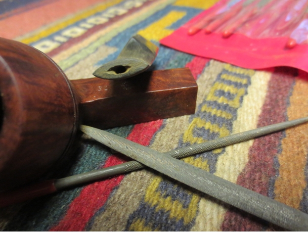 I started the restructuring work on the stem with a Dremel and a sanding drum. I took the damaged areas back until I had some solid briar to work with. I did not want to remove too much of the stem material. The twin airways in the stem were very close to the surface in the stem at this point so I would need to do something a little different from the standard recutting a new button on the existing material.