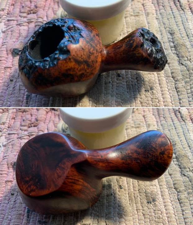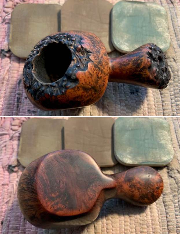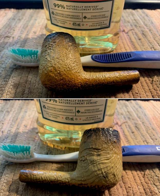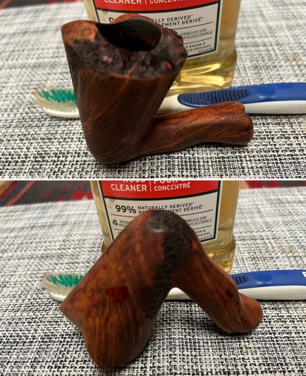 I am really happy to have Jeff’s help on cleaning up the pipes that we pick up along the way. He reamed the bowl with a PipNet pipe reamer and cleaned up the reaming with a Savinelli Fitsall Pipe Knife. He scrubbed out the internals with alcohol, pipe cleaners and cotton swabs until the pipe was clean. He scrubbed the exterior of the bowl with Murphy’s Oil Soap and a tooth brush to remove the grime and grit on the briar and the lava on the rim top. The finish on the shank and bowl sides was quite coated with varnish and was shiny. The rim top was heavily burned and the inner edge was badly burned. The lightly rusticated portion on the right side was almost smooth from the burn damage. It was a huge mess. Jeff scrubbed the stem with Soft Scrub All Purpose Cleaner to remove the majority of the grime. When the pipe arrived here in Vancouver it looked very good.