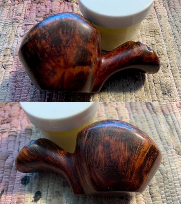 I stripped the varnish coat on the bowl and shank with acetone on cotton pads. I was able to remove the full shiny coat and it looked significantly better.