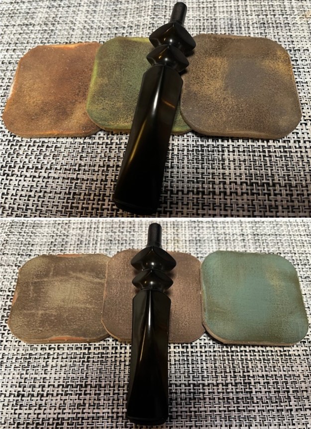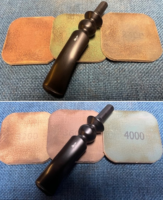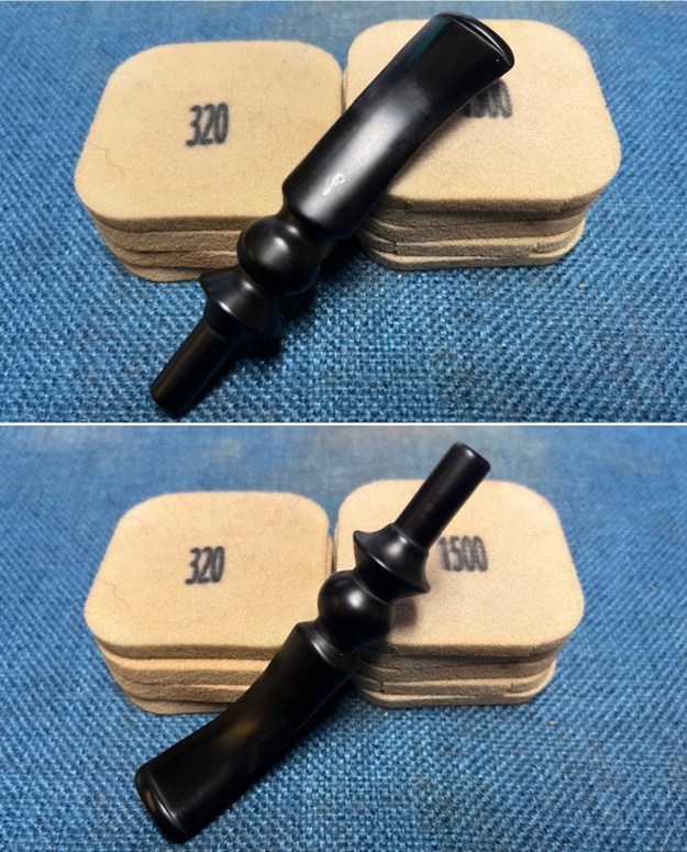 I set the bowl aside and turned my attention to the vulcanite stem. I sanded the stem with 320-3500 grit sanding pads to remove the tooth marks and chatter against the button edge. I wiped the stem down between pads with an Obsidian Oil cloth to remove the sanding debris from the stem.