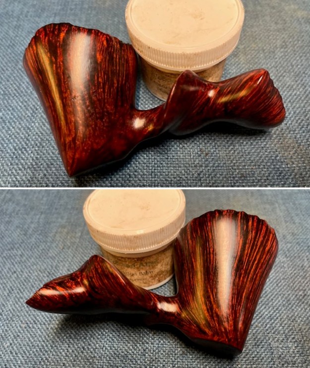 I worked some Before & After Restoration Balm into the surface of the briar with a shoe brush to get into the carving on the rim top and shank end and my fingertips on the smooth. The product works to clean, enliven and protect the briar. I let the balm sit for 15 minutes and then buffed with a cotton cloth to raise the shine. The photos show the bowl at this point in the restoration process.