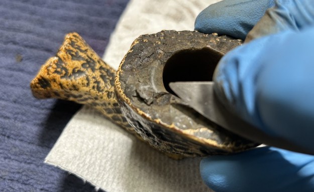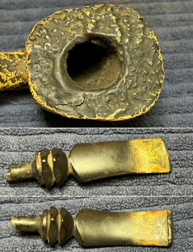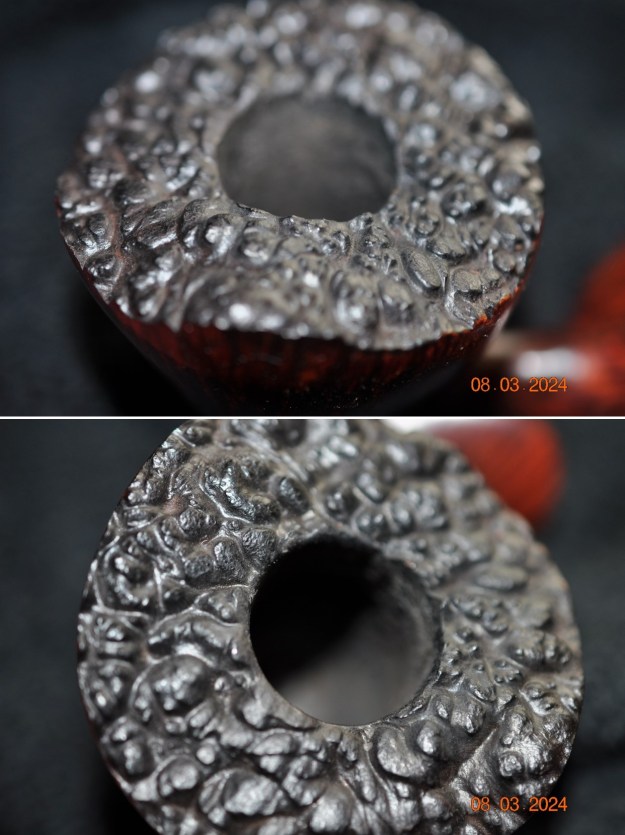He took photos of the rim top and bowl to give a clear picture of the thickness of the cake and tobacco debris as well as the lava in the plateau on the rim top. He also took photos of the top and underside of the stem. The photos show the overall condition of the stem.