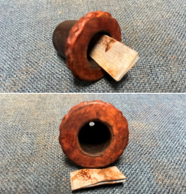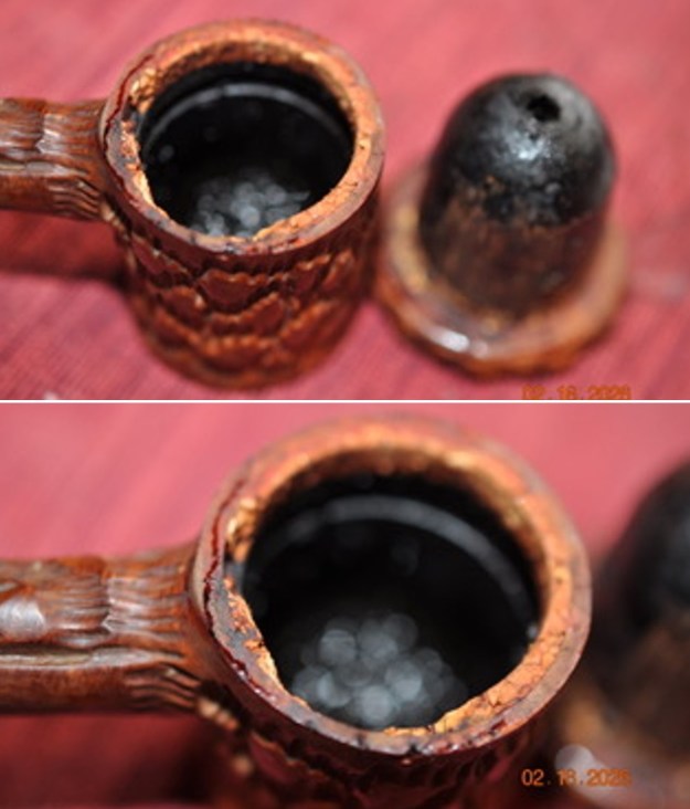 Jeff put the bowl in the freezer to try and loosen the insert from the calabash base. After some time, there he was able to remove the insert. He took photos of the parts to show the dirty condition. There was crumbling cork gasket around the inner edge of the calabash base. It will need to be replace.