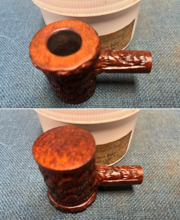 I rubbed the bowl and shank down with Before & After Restoration Balm. I worked it into the surface of the bowl sides and shank with my fingertips and a shoe brush to get it into the depths of the rustication. The product works to clean, enliven and protect the briar. I let the balm sit for a little while and then buffed with a cotton cloth to raise the shine. The Balm did its magic and the grain stood out.