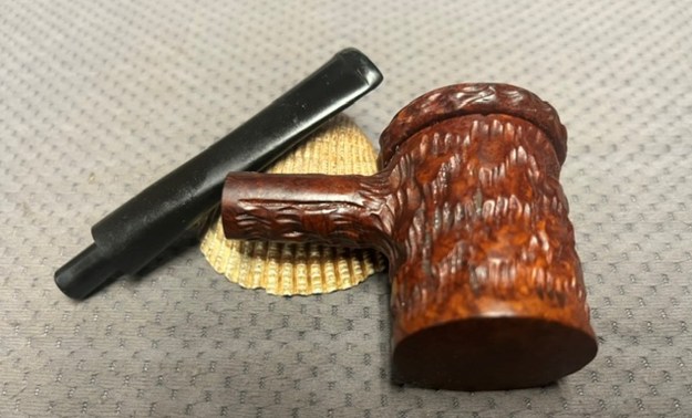 The next pipe on the table is a rugged looking the Campaign style pipe with a deep rustication. It was one purchased on 01/20/2026 from a Facebook seller in Quaker Town, Pennsylvania, USA. The bowl and the shank are heavily rusticated. The top of the bowl insert, base of the calabash and the end of the shank band are smooth. It is a great looking pipe. It is stamped on the left side of the shank and reads Weber in an oval [over] Imported Briar. The finish was dirty and had a lot of grime and grit ground into the rustication and the smooth portions. The rim top and inner edge of the bowl is dirty with a thick overflow of lava the edge and the top that was heavier toward the back of the bowl. The bowl insert was stuck in the calabash base and had no give. There is a thick cake in the bowl. The vulcanite taper stem is dirty and has light tooth marks and chatter on the surface ahead of the button. There were no logo stamps on either side of the stem. Jeff took photos of the pipe before he started his clean up work. It showed a lot of promise.