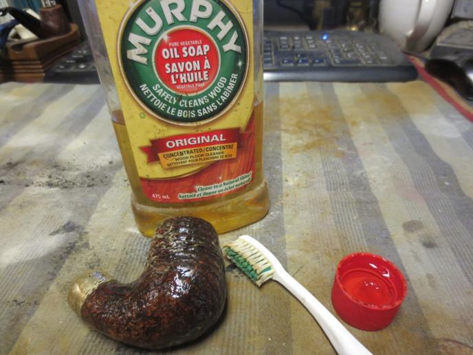 Now I turn to cleaning the external bowl using undiluted Murphy’s Oil Soap and cotton pads. I also utilize a brass wire brush on the rim. After scrubbing, I rinse the bowl in cool tap water. The rim is not in good shape and will have to be topped to clean it up. The two fills I saw on the heel of the stummel are not solid and are not flush with the surface. I use a sharp dental probe to dig out the old filler. I will patch these later.