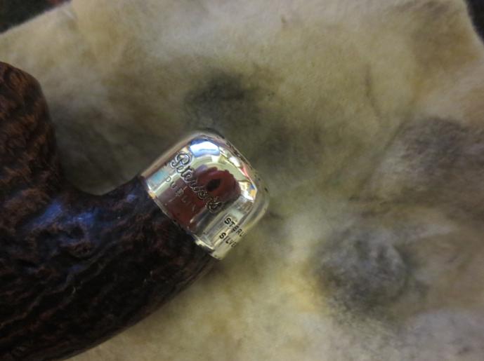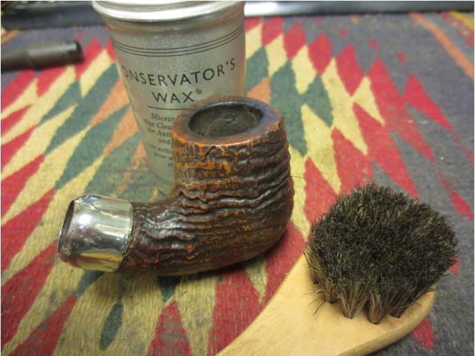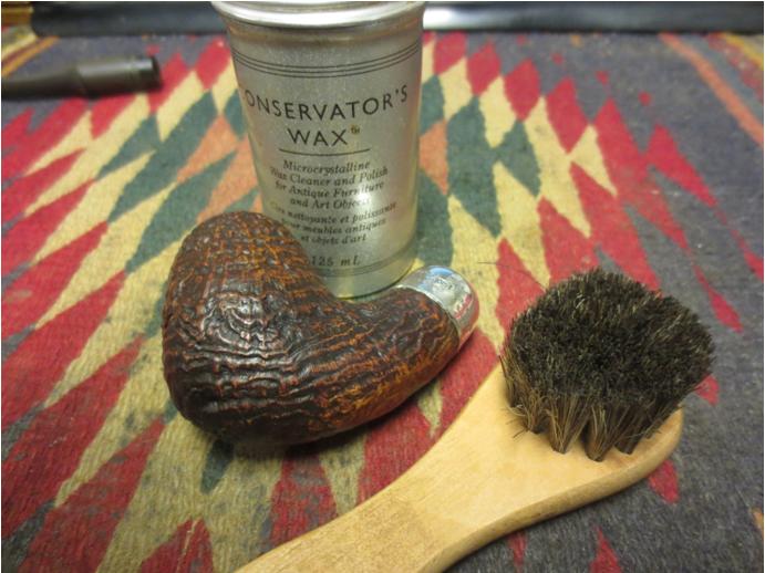Before I move on to applying the wax, I have one more project. The Peterson ‘P’ stamp on the stem needs some touching up. I use white acrylic paint to do the enhancement. I lightly apply a coat of the paint over the ‘P’ stamping and while still wet, I dab it very lightly with a cotton pad leaving a film – in the second picture below. It doesn’t take long to dry, leaving the ‘P’ filled with paint. I then lightly scrape the dried paint off the surface using the middle, flat section of a toothpick. The toothpick slides over the top of the ‘P’ leaving the freshened stamping. It looks great!