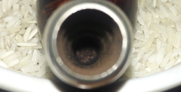 I just realize that I became so involved in the technical aspects of this restoration that I forgot to clean the internals of the stummel! Back to the dirty work. I use pipe cleaners and cotton buds dipped in isopropyl 95% and go to work. I also use dental spatulas and probes to scrape the mortise walls. I also utilize a shank brush to scrub the airway and the mortise walls. I read how challenging Petersons are in the clean-up and this one is no exception. I expend a lot of cotton buds, alcohol and time and I seem to be making no dent in the gunk carnage. I finally halt this approach and decide to let it cook overnight in a kosher salt and alcohol bath. Using a cotton ball, I fashion a wick which I insert down the airway and into the sump area of the mortise. I fill the bowl with kosher salt, which, unlike iodized salt, does not leave an aftertaste. I then fill the bowl with alcohol and let it sit overnight. Time to turn out the lights.