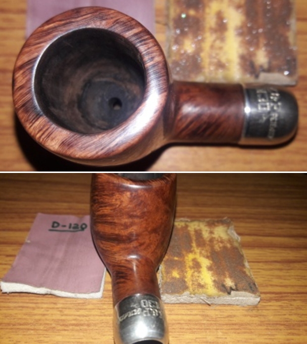 The darkened areas on the rim (picture above) are residual effects of scorching. To minimize this, I will cut an internal rim bevel to remove the damage as well as adding a touch of class to this already classy Peterson’s System Standard. I start with a coarse 120 grit paper to do the initial beveling. I pinch the rolled piece with my thumb and rotate it around the internal rim circumference creating the even bevel. I follow the 120 paper with a rolled piece of 240 grade paper then 600. I repeat the same process for the external rim circumference. The bevel looks good. The pictures show the progression.