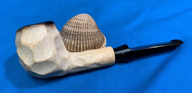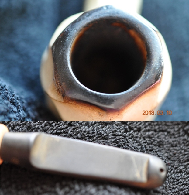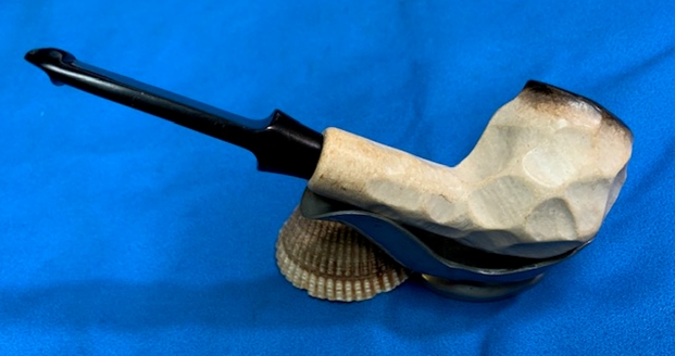 Jeff had done a great job cleaning up the pipe as usual. He reamed the pipe with a PipNet reamer and cut back the cake back to the bare meerschaum. He cleaned up the walls with a Savinelli Fitsall Pipe Knife. He scrubbed the interior of the bowl and shank with pipe cleaners, cotton swabs and alcohol to remove the tars and oils. He scrubbed the exterior of the pipe with Murphy’s Oil Soap and a tooth brush to remove the grime from the finish. He worked on the rim top lava and darkening with the soap and tooth brush. He scrubbed the inside of the stem with alcohol and pipe cleaners. He scrubbed the exterior with Soft Scrub and then soaked it in Before & After Deoxidizer. He washed it off with warm water to remove the Deoxidizer. The pipe looked very good when it arrived.