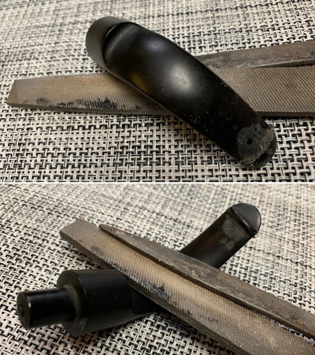 Now that the stem is clean and dry, I set about fixing the very minor dents in the vulcanite. This is done by filling those divots with black cyanoacrylate adhesive, impregnated with carbon and rubber. I left this to cure and moved on.