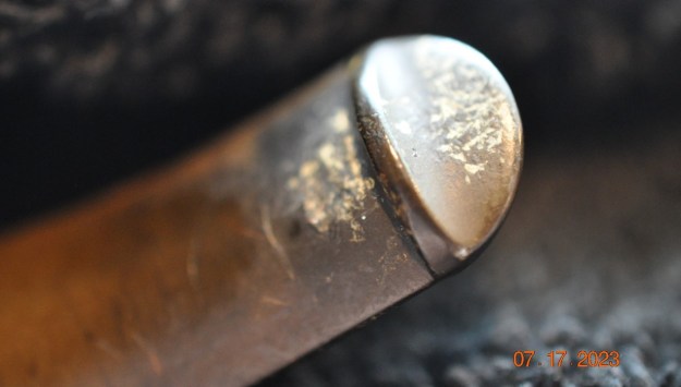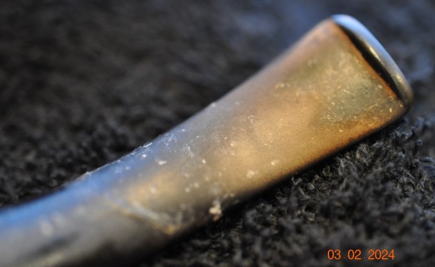 The goal of the next step is the removal (or minimization) of oxidation. Going to my sink, I used cream cleanser, cotton rounds, and a toothbrush, and scoured the stem to remove as much surface oxidation as possible. As the photos show, the result is a hideous brownish mess – but better off the stem than on it.