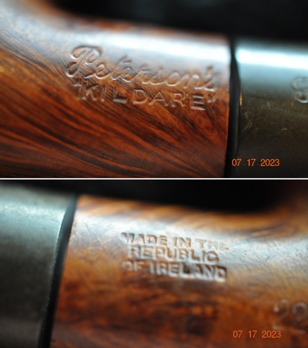 The markings are as follows: on the left shank, we read Peterson’s [over] “Kildare”; on the right shank, we read Made in the [over] Republic [over] of Ireland. Immediately to the right of that is the shape number, 405S. Finally, on the stem, we see the stylized P of the Peterson Pipe Company.