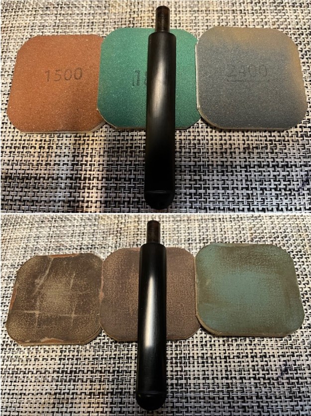 The penultimate step for the stem is sanding. First, with my set of needle files, I reduce the bulk of the cyanoacrylate repairs. I want to remove the excess adhesive as near to the surface as possible, without cutting into the vulcanite. Following that, I use all nine of the micromesh sanding pads (1,500 through 12,000 grit) to sand out flaws, even out the vulcanite, and provide gentle polishing of the finished surface. I also apply pipe-stem oil while using the last five micromesh pads. There was a wonderful, deep black shine to the stem when I was done.