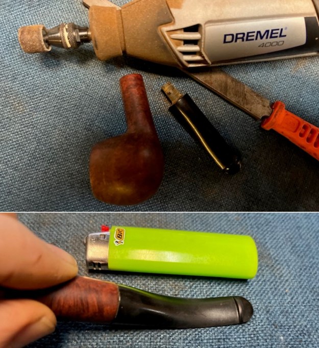 Now that the stem is (nearly) complete, I can move on to the stummel. The first step for me is to ream out the bowl – that is to say, remove all the cake inside the bowl. This accomplishes a couple of things. First (and most obviously), it cleans the bowl and provides a refurbished chamber for future smoking. Second, when the old cake is removed, I can inspect the interior walls of the bowl and determine if there is damage or not. In this case, the bowl was clean enough that I only used a a piece of sandpaper taped to a wooden dowel to remove the little debris.