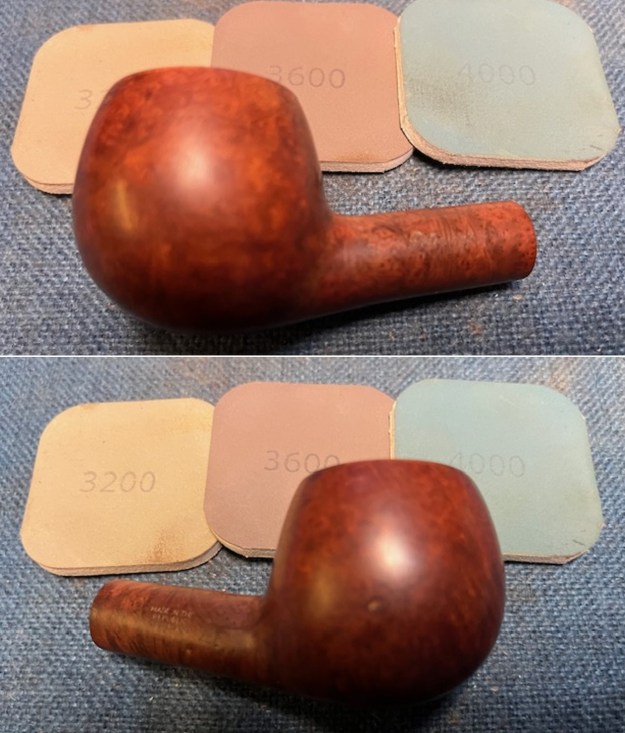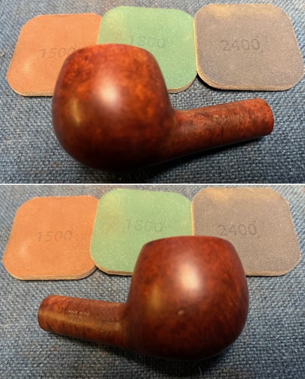 I then used all nine micromesh pads (1,500 through 12,000 grit) on the outside of the stummel to finish it off. This sanding minimizes flaws in the briar and provides a beautiful smoothness to the wood. I rubbed some Before & After Restoration Balm into the briar and let it sit for 20 minutes or so. The balm moisturizes the wood and gives a beautiful depth to the briar. I then buffed it with a microfibre cloth.