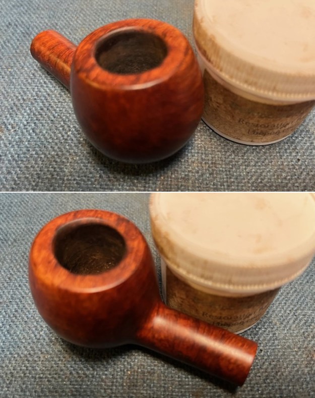 I then decided to ‘de-ghost’ the pipe – that is to say, exorcize the remaining filth from the briar. I filled the bowl and the shank with cotton balls, then saturated them with 99% isopropyl alcohol. I let the stummel sit overnight. This caused any remaining oils, tars and smells to leach out into the cotton.