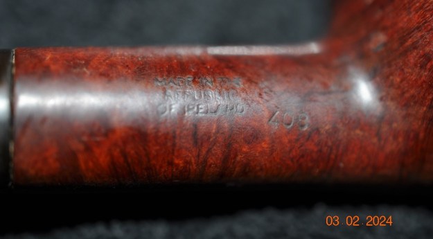 In looking up this pipe shape, I came upon a page from Mark Irwin’s blog, Peterson Pipe Notes. It had some useful information on the 400 series in general and this very pipe in particular: