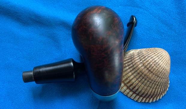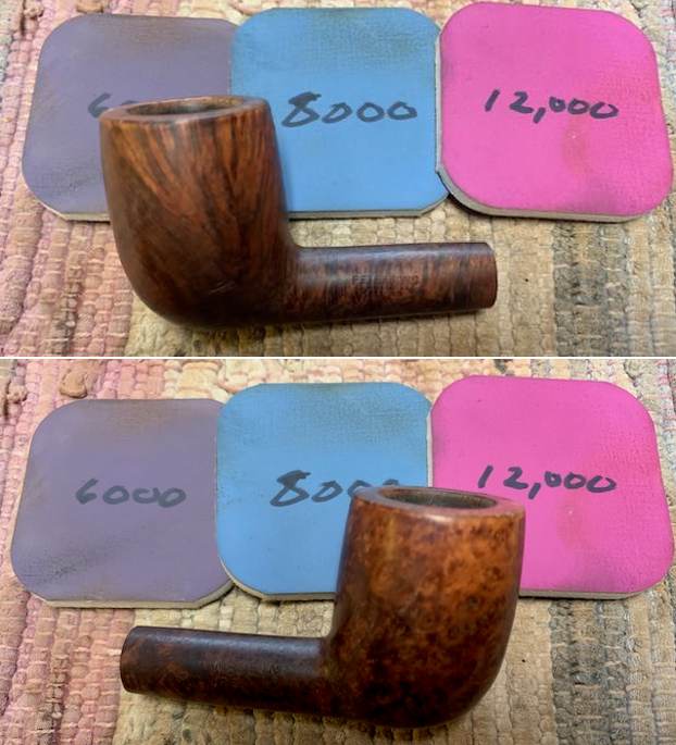 I polished the bowl with micromesh sanding pads – dry sanding with 1500-12000 grit sanding pads. I wiped it down between pads with a damp cloth. It really began to take on a deep shine. There is a dark spot on the right side of the bowl. It is solid so it is not a fill. My guess is that it is where a root or such came out of the briar.