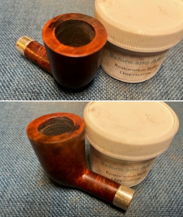 The exterior of the bowl looks better after sanding. I worked some Before & After Restoration Balm into the briar with my finger tips. I let it sit on the bowl for 10 minutes and then buffed it off with a paper towel and soft cloth. The product is a great addition to the restoration work. It enlivens, enriches and protects the briar while giving it a deep glow. It is a product I use on every pipe I restore.