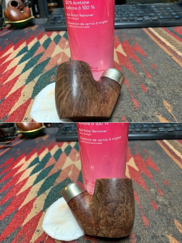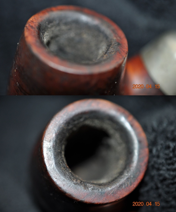 I took photos of the bowl and rim top to show how clean it was. There is some wear on the finish around the outer edge and the rim top is roughened. The replacement stem looks clean of oxidation and there is light tooth chatter on both sides of the stem.