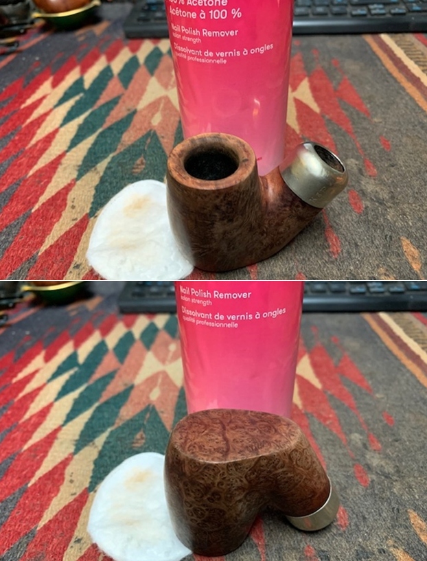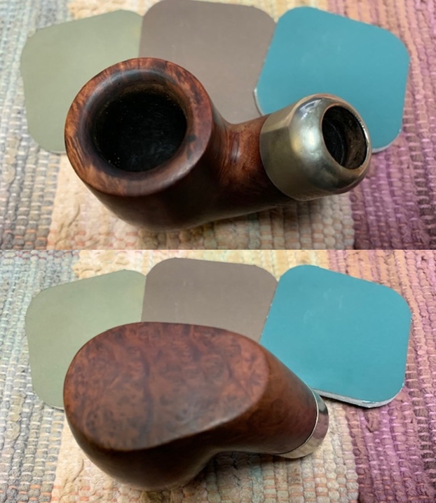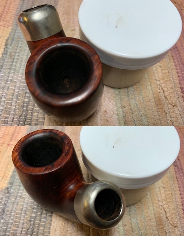 Armed with that information I turned to work on the pipe itself. Jeff had done a great job cleaning up the pipe as usual. He reamed the pipe with a PipNet reamer and cut back the cake back to the bare briar. He cleaned up the walls with a Savinelli Fitsall Pipe Knife. He scrubbed the interior of the bowl and shank with pipe cleaners, cotton swabs and alcohol to remove the tars and oils. He scrubbed the exterior of the pipe with Murphy’s Oil Soap and a tooth brush to remove the grime from the finish. He scrubbed the inside of the stem with alcohol and pipe cleaners. He cleaned the nickel ferrule with Soft Scrub and buffed it off with a soft pad. Somewhere along the journey from Idaho to Vancouver I had replaced the damaged stem with the one in the photos. It is an identically shaped and sized stem and with it in place the pipe looks good. I took photos of the pipe before I started working on it.