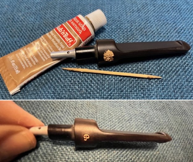 I set the bowl aside and turned my attention to the stem. On other Deluxe pipes I have used gold to touch up the stamp rather than white acrylic. I touched up the “P” stamp on the left side of the stem with some Rub’n Buff Antique Gold. I worked it into the stamp with a tooth pick. I buffed it off with a soft cloth and some Obsidian Oil. It looked very good.
