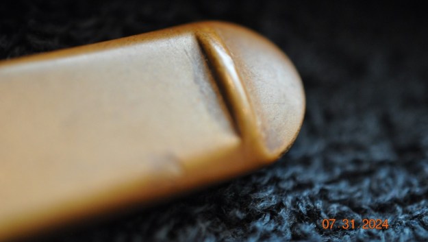 I took some photos of the rim top and stem. The rim top and bowl looked very good. The cake and lava overflow were gone and the inward bevelled rim was very clean. There was also some darkening on the bevelled inner rim edge and light damage on the edge of the top and the bevel. Jeff had been able to get rid of all of the lava and tars. The rim top looked good with light marks and scratches on the surface. The closeup photos of the stem shows that it is a much cleaner and better looking stem. The tooth marks and chatter were still present ahead of the button.