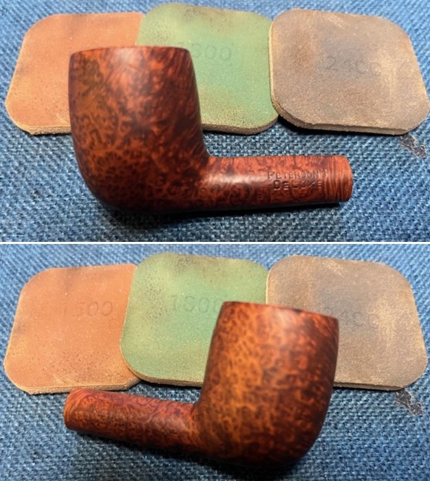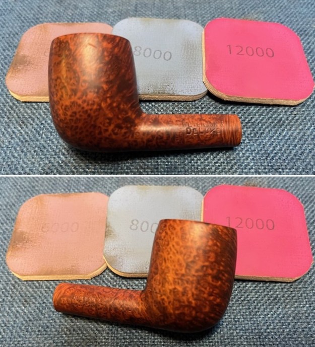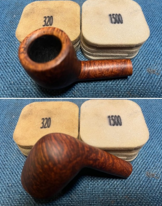 I used 320-3500 grit 2×2 inch sanding pads to remove the darkening on the rim edges and top as well to smooth out some of the scratches in the briar. Once finished it was ready to be polished.