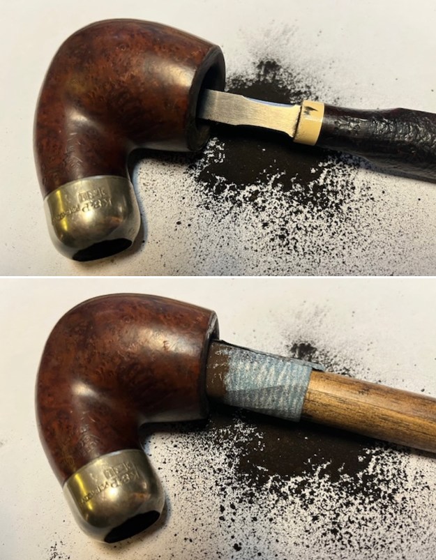 I reamed the pipe with a PipNet pipe reamer using the first two cutting heads. I followed up with a Savinelli Fitsall Pipe Knife to clean up the remnants of cake left in the bowl and check the bowl walls. I sanded the bowl with a piece of dowel wrapped with 220 grit sandpaper. It looked much better at this point.