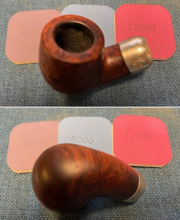 I polished the bowl and worked on the rim top with micromesh sanding pads – dry sanding with 1500-12000 grit sanding pads. I wiped it down between pads with a bit of olive oil on a paper towel. It really began to take on a deep shine. The grain really began to show on the briar.