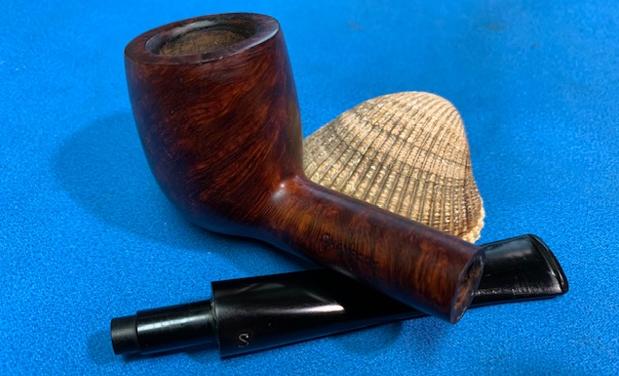 Shamrock (c1941-2009) Originally stamped SHAMROCK with no brand name, an inexpensive line first described in George Yale (New York) mail order booklet in 1941, imported by Rogers Import. The line was actively promoted beginning in ’45, aggressively promoted in US by Rogers from early ‘50s when they registered the Shamrock logo with US Patent Office, claiming propriety since ’38. Over the years offered with P-lip or fishtail mouthpiece, with or without nickel band, with or without shamrock logo on the band, with or without S stamped in white or later in gold on mouthpiece. Appearing in 2008 as unstained smooth and rustic, fishtail mouthpiece with gold impressed P on the stem. COMS of MADE IN over IRELAND (C1945-1965), MADE IN IRELAND forming a circle (c1945-1965), “A PETERSON’S PRODUCT” over MADE IN IRELAND (c1945-1965), MADE IN THE over REPUBLIC over OF IRELAND c1948-1998). Model is always difficult or impossible to date.