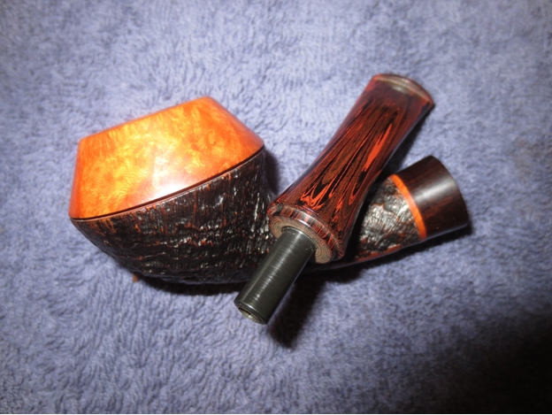 The overall construction of this pipe is very well done. It is light in the hand and in the mouth. The shaping of the stem is exactly what I like in terms of the feel in my mouth. The blade from the button to the saddle is deep enough to give room for how it sits in my mouth. It is well balanced and tactile feel of the deep blast as it warms up during the smoking of a bowl is very pleasant. Like others in my American carver collection, I smoked the pipe at specific times in my life. Since it is a small pipe and comes with a thick leather pipe bag it is a pipe that I have carried with me on various trips I have taken for work. It is a pipe I enjoy smoking while walking on the streets during my visits to other cities and when sitting at a sidewalk café along the way. It is also one I smoke at home on the porch on weekly walkabouts. Since I received it I have smoked it enough to have a good thin cake developing in the bowl. I have dedicated the pipe to Virginia and Virginia Perique tobaccos. It delivered a good smoke from the first smoke I had in the bowl and continues to do so to this day. It draws well; the lighting has never been a problem and continues to be an effortless smoke. Now that I am writing this review up, the pipe is sitting next to my chair to smoke on the weekend. Thanks Grant for delivering a beautiful, well-made pipe that remains a very good smoking pipe to this day.