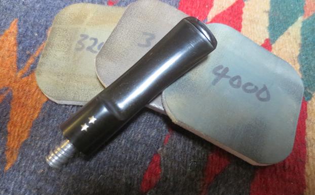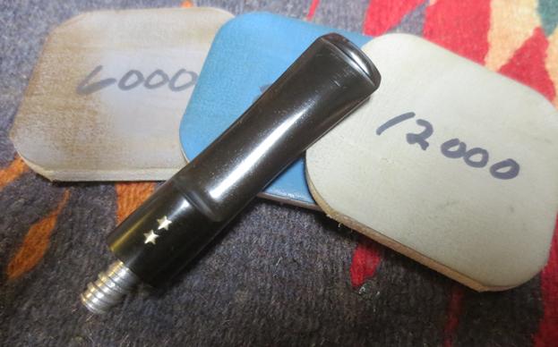 I sanded the stem surfaces with 220 grit sandpaper to remove the light oxidation and the button. I polished the stem with micromesh sanding pads – wet sanding it with 1500-2400 grit pads and buffed it with red Tripoli to remove the oxidation that showed up in the first photo below. I dry sanded it with 3200-12000 grit pads. I rubbed the stem down with Obsidian Oil after each pad to give traction to the next pad and also bring a little life to the vulcanite stem. After the final pad I gave it a last coat of the oil and set it aside to dry. The next series of photos show the development of the shine on the rubber stem.