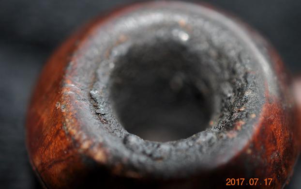The next two photos show the condition of the bowl. You can see from the photos that the bowl is thickly caked and there is a heavy lava overflow on the rim top and the inner edge of the bowl. It covers the beveled rim top to where it almost looks flat. There appears to be some nicks and damage on the front outer edge of the bowl but I won’t know until it has been reamed and cleaned.