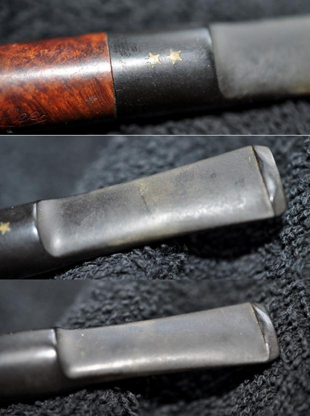 The saddle stem had two gold stars inset in the top portion of the saddle equidistant from the front and back of the saddle. The stem was dirty, sticky and lightly oxidized. There were light tooth marks on the top and underside at the button and on the sharp edge of the button.