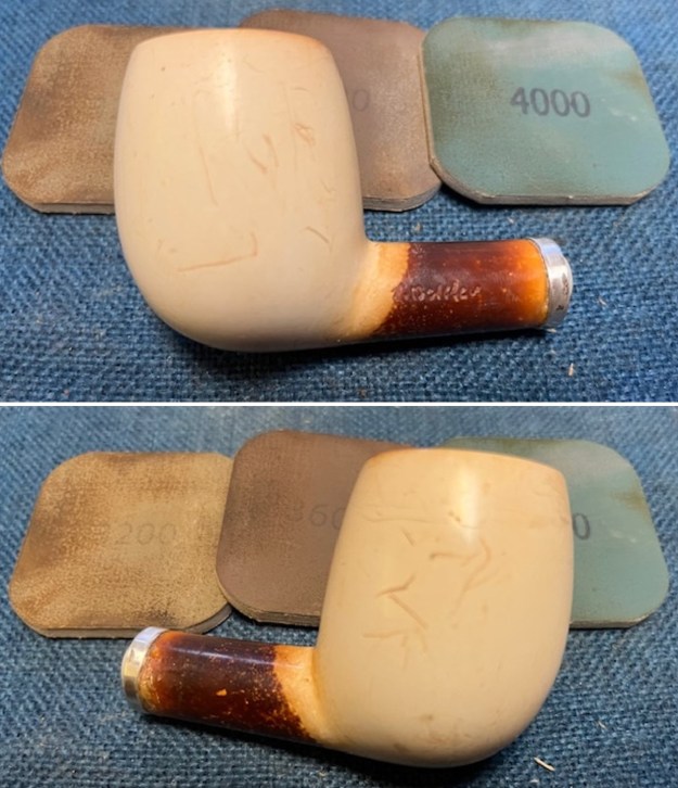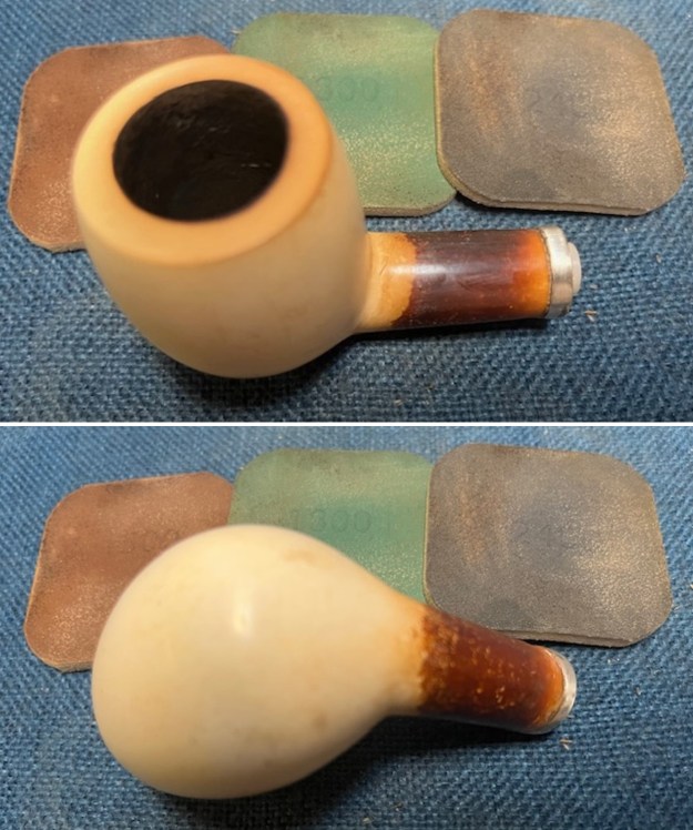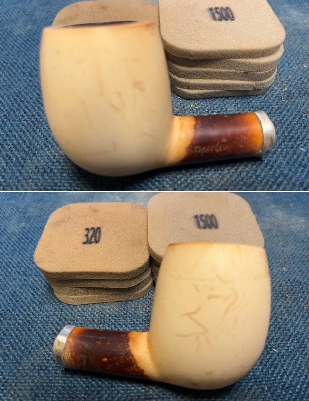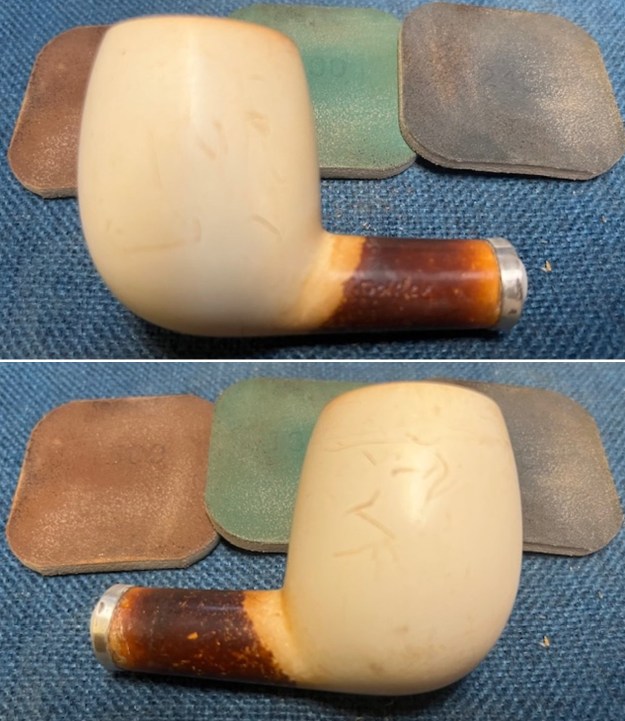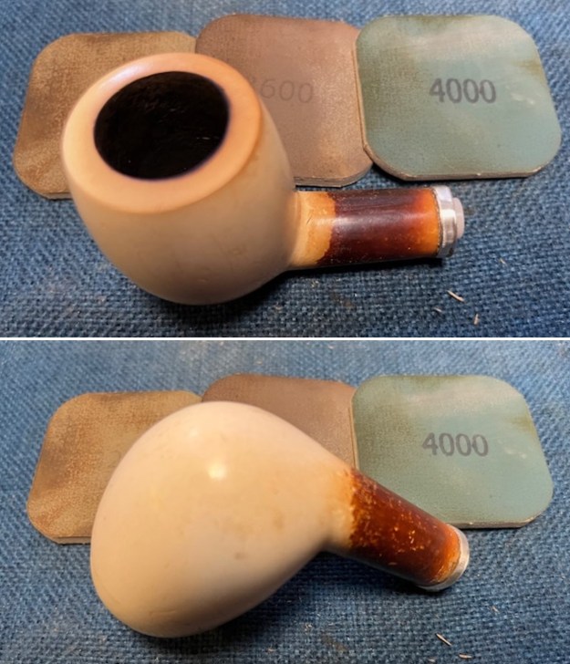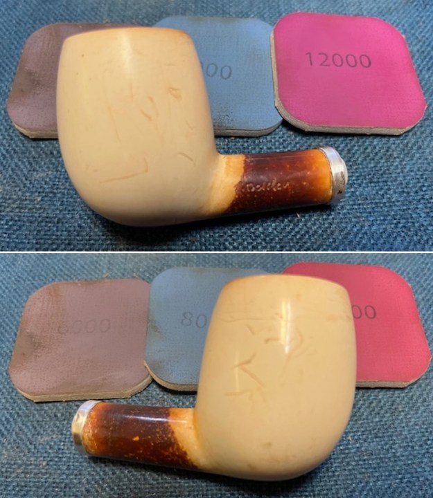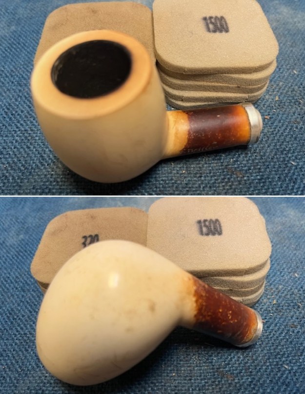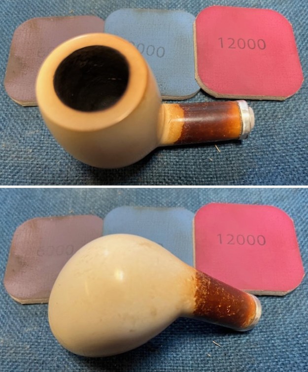I polished the meerschaum with 1500-12000 grit sanding pads. I wiped the bowl down after each sanding pad with a damp cloth to remove the sanding debris. By the time I finished the bowl took on a rich and clean shine.