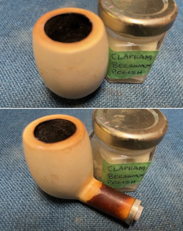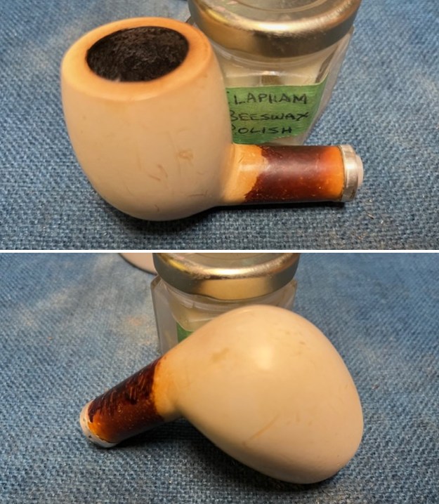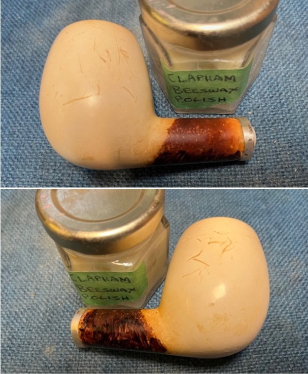 I rubbed the meerschaum down with some Clapham’s Beeswax/Carnauba Wax. I let it sit for a short time then hand buffed it with a soft cloth to raise the shine on the meer.