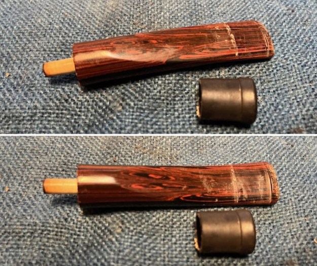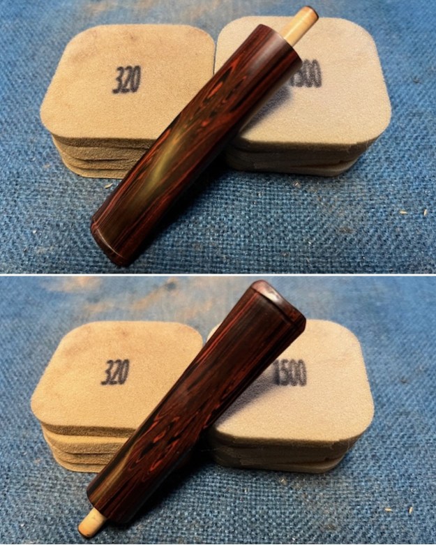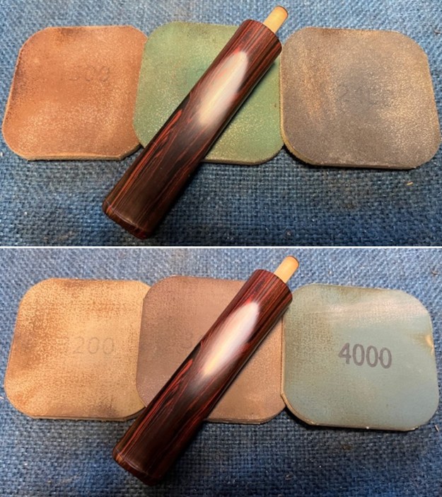 I set the bowl aside and turned my attention to the stem. I sanded the stem with 320-3500 grit 2×2 inch pads. I wiped the stem down with an Obsidian Oil cloth after each sanding pad. The rich look of the Cumberland began to take on a shine.