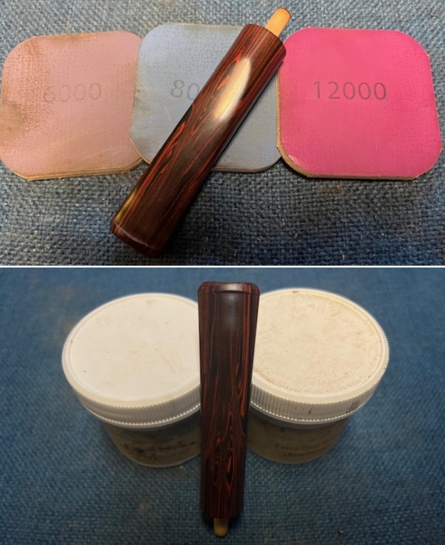 I polished the vulcanite with micromesh sanding pads – 1500-12000 grit pads. I wiped it down with Obsidian Oil after each sanding pad. I used Before & After Pipe Polish – both Fine and Extra Fine to further polish the stem.