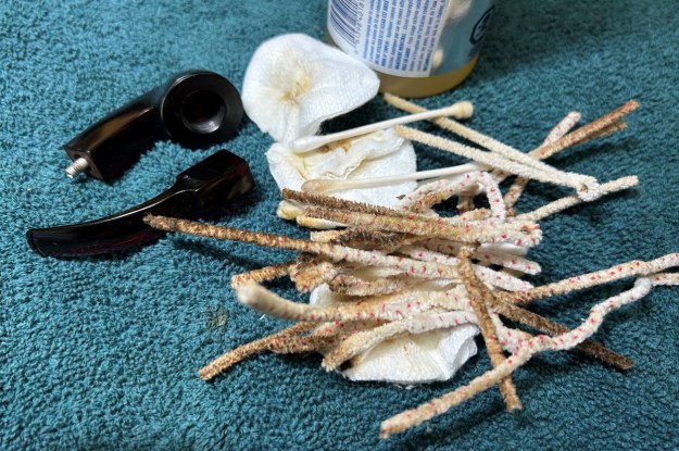 I used oil soap on a few cotton rounds and wiped down the stem and stummel to provide an initial cleaning before moving on to the next steps. The primary cleaning came next. I disinfected the inside of both stem and stummel with pipe cleaners and cotton swabs dipped in 99% lemon-infused isopropyl alcohol. I scrubbed thoroughly to make sure the interior was very clean. I paid particular attention to the tenon and cleaned it further with some 0000-grit steel wool.