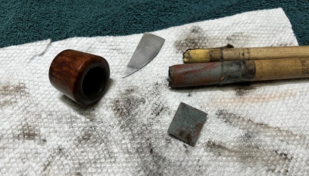 Next on to the briar bowl. First, I reamed out the bowl – that is to say, remove all the cake inside the bowl. This accomplished a couple of things. First (and most obviously), it cleaned the bowl and provided a refurbished chamber for future smoking. Second, when the old cake was removed, I could inspect the interior walls of the bowl and determine if there was damage or not. As the bowl was fairly clean already, I used only a piece of sandpaper taped to a wooden dowel. This ensured that all the debris was removed. I also took a piece of machine steel and gently scraped the lava away from the rim. The metal’s edge is sharp enough to remove what I need, but not so sharp that it damages the rim.