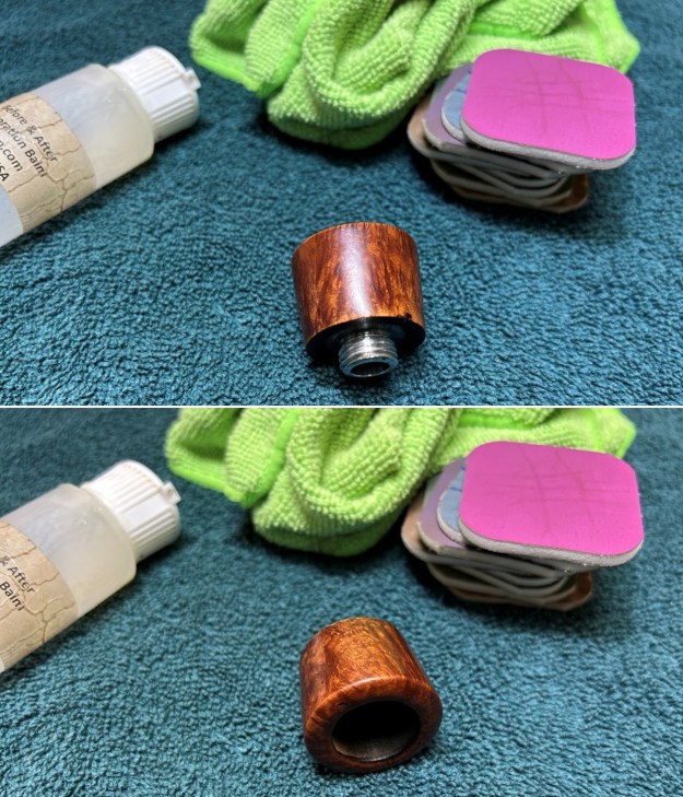 I used all nine micromesh pads (1,500 through 12,000 grit) to sand the outside of the bowl and finish it off. This sanding minimizes flaws in the briar and provides a beautiful smoothness to the wood. I rubbed some LBE Before & After Restoration Balm into the briar and let it sit for 30 minutes or so. The balm moisturizes the wood and gives a beautiful depth to the briar. I then buffed the bowl with a microfibre cloth. For the final step, I took the pipe to my bench buffer and carefully polished it – first with a blue diamond compound, then with three coats of carnauba wax. This procedure makes the pipe look its best.