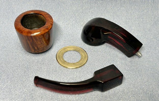 Let’s take a closer look. The pipe is in terrific condition for its age! The Redmanol parts have a few minor scratches and dents, but no cracks or structural problems. The screw tenon is as dirty as anything, but that’s no big deal. The brass ring is similarly dirty, but not damaged at all. Finally, the briar bowl is also dirty and has a few minor nicks. It should clean up very nicely.