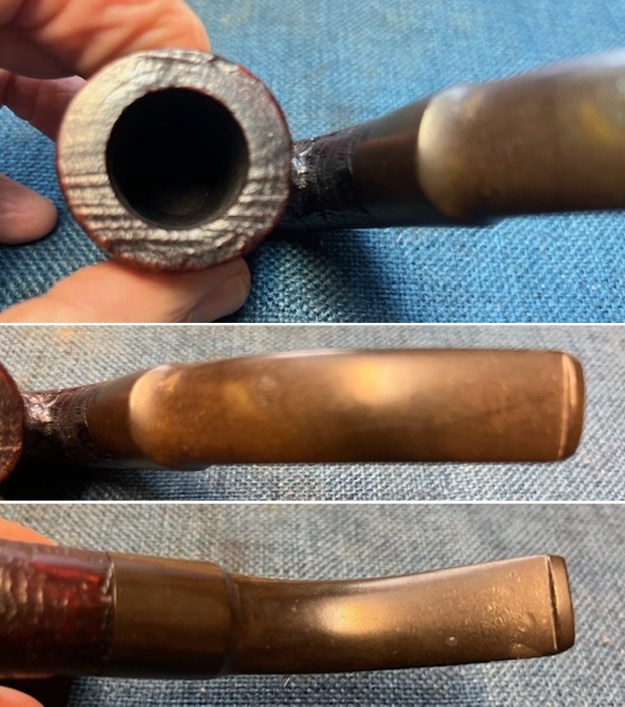 - The vulcanite saddle stem looks very good and cleaned up well. The light tooth marks an chatter will be easily polished out. There is no logo on the sides of the stem.