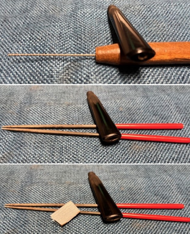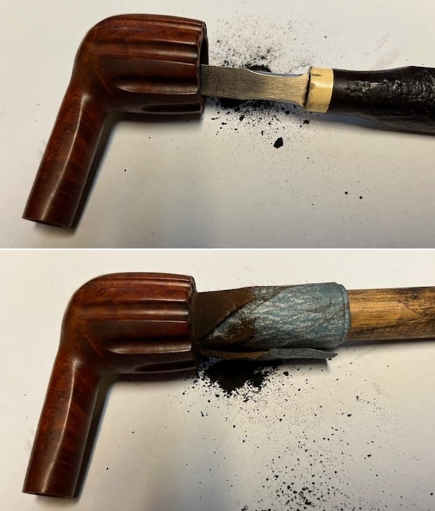 I set the bowl aside and worked on the stem. I used the slot saw and a series of flat files to shape the slot and make it a football shape. I cleaned up the shape with a folded piece of 220 grit sandpaper to smooth out the slot. It worked very well and the slot began to take on a very classic look.