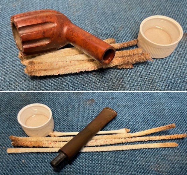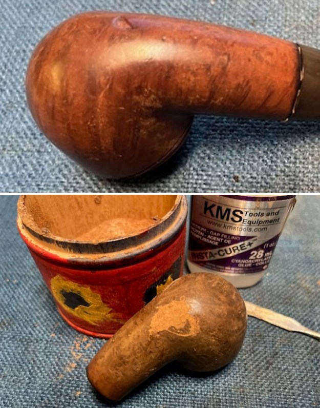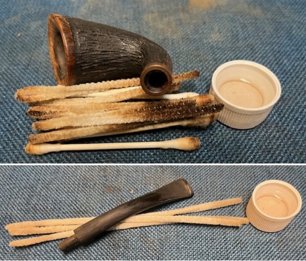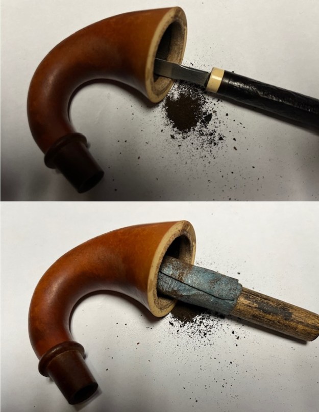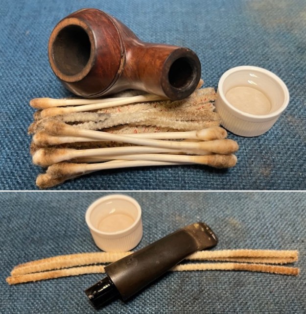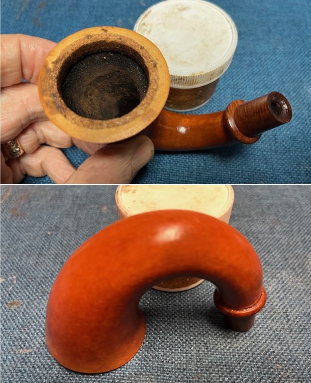 Jeff reamed the bowl with a PipNet pipe reamer and followed up with a Savinelli Fitsall pipe knife to remove the cake. He scrubbed out the mortise and the airway in the shank and the stem with alcohol, cotton swabs and pipe cleaners. He scrubbed the exterior of the bowl, rim, shank and stem with a tooth brush and Murphy’s Oil Soap to remove the oils and tars on the rim and the grime on the finish of the bowl. He rinsed it under running water. He dried it off with a soft cloth. He was able to the lava build up on the rim top and you could see a little darkening in the finish on the top of the bowl. I took photos of the pipe bowl to show its condition before I started my work on it.