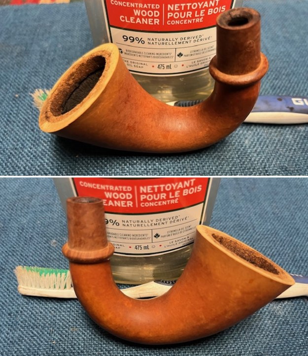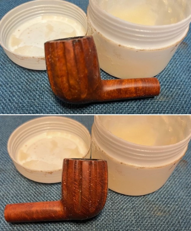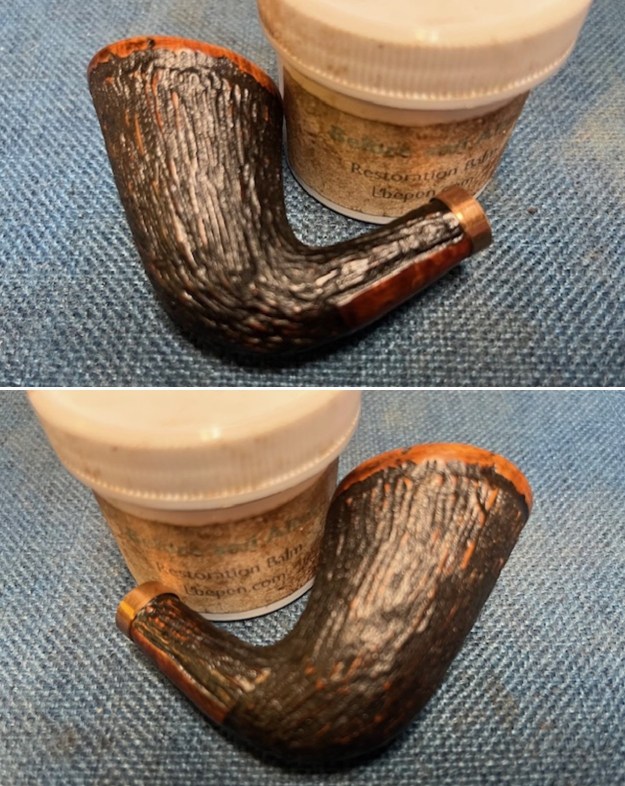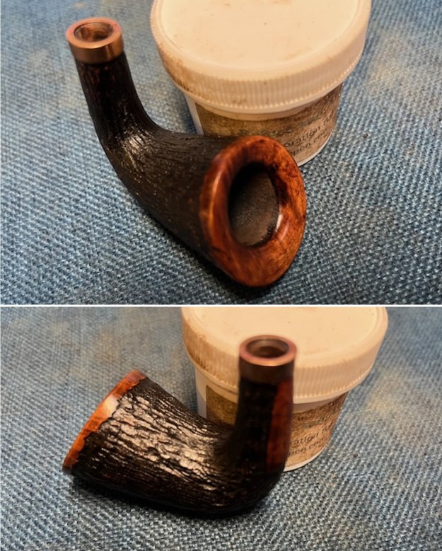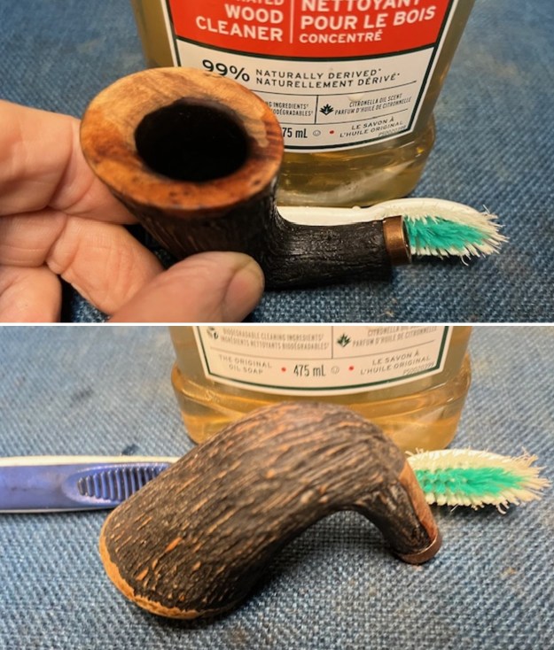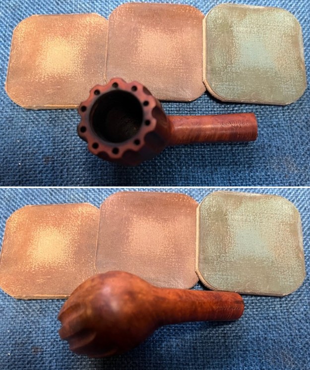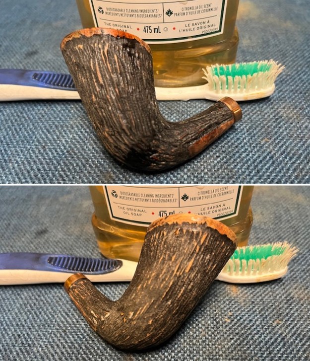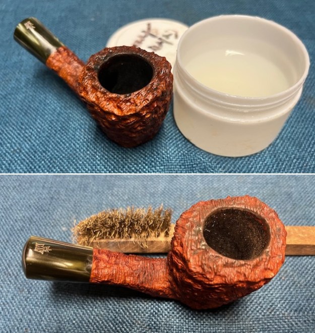 I cleaned the rim top with Before & After Briar Cleaner to soften the dark spots and darkening on the rim top. I used a brass bristle wire brush with the product deep clean the grooves in the double rusticated rim top.